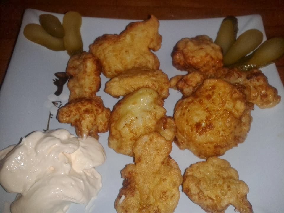 -Con el aceite muy caliente freímos los arbolitos de coliflor hasta que quede un color dorado y lo sacamos así hasta que friamos todo. Lo sacamos y escurrimos en un papel de cocina todo el aceite que reste. Podemos decorar con un pepino y mayonesa.