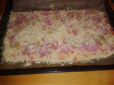 - Comenzamos con el relleno de la pizza, mientras tanto ponemos el horno a pre-calentar a 200º que vaya cogiendo temperatura, seguimos con el relleno. Bueno decir que los ingredientes básicos de la pizza son: