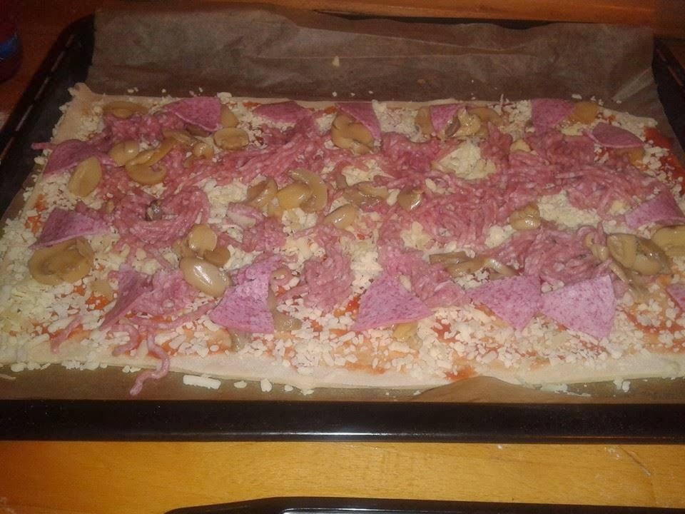 Luego rellenáis yo utilice Tomate, mozarella, orégano, queso parmesano, carne picada, salami y champiñones. Terminamos con esta rica pizza, introducimos la bandeja en el horno a 180º 40 minutos aproximadamente. Aquí os dejo unas fotos como orientación.