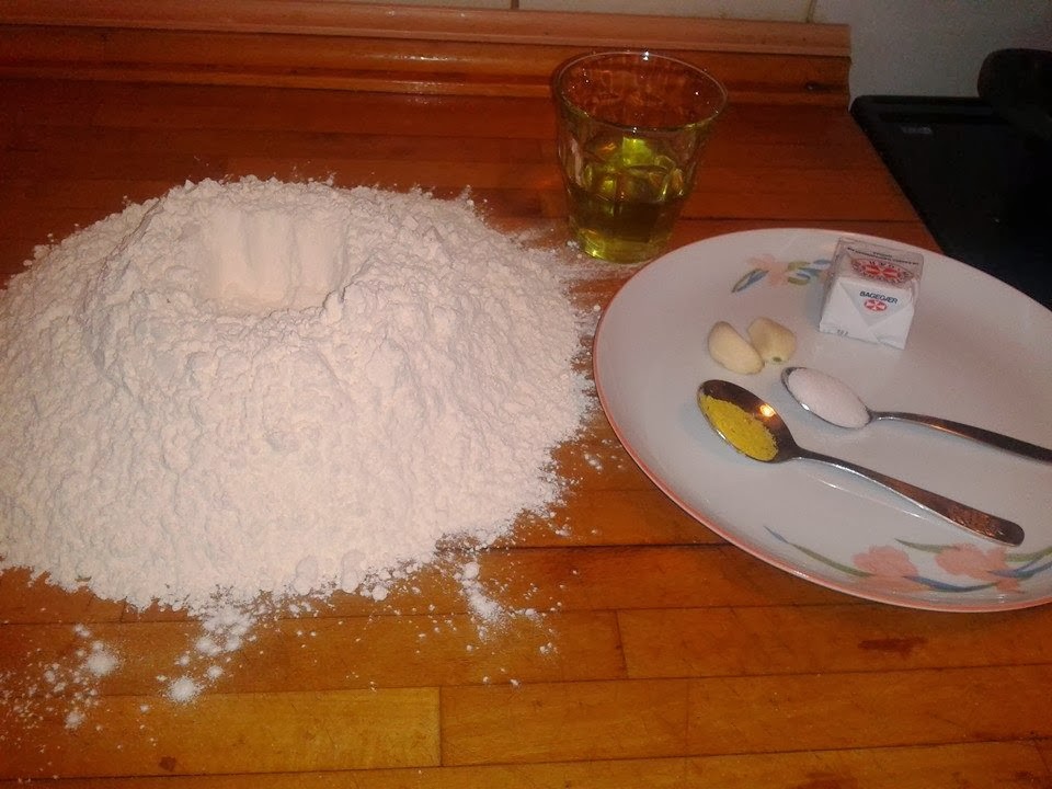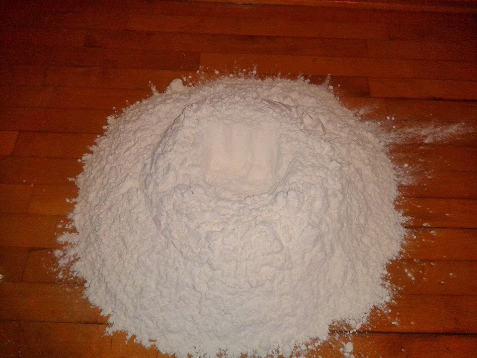 - Colocamos la harina primeramente en nuestra zona de trabajo previamente tamizada. Hacemos un hueco en su centro en forma de volcán para ir incrementando los ingredientes.