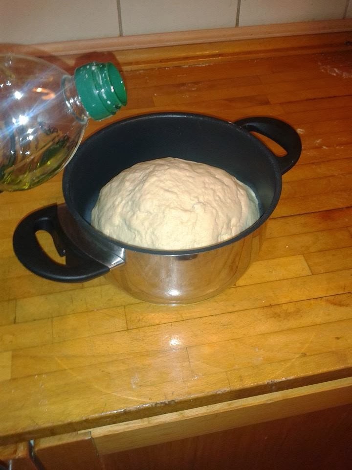- Ya tenemos nuestra masa preparada, la metemos en un recipiente cerrado y echamos un chorrito de aceite encima, asegurándonos de que quede todo bien empapado para que nuestra masa no se quede dura en el tiempo de fermentación.