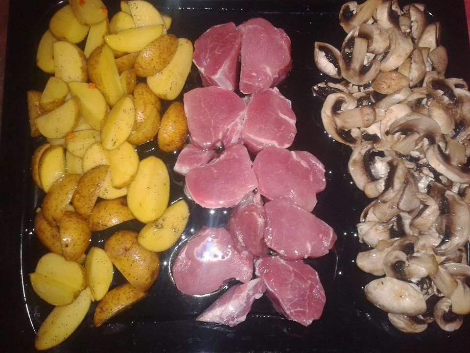 -Preparamos todos los ingredientes en una bandeja como esta y calentamos el horno a 200º durante 5 min para luego introducir la bandeja en el.