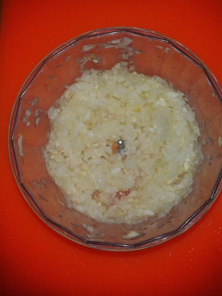 -Molemos la cebolla y el ajo y comenzamos a freír con una pizca de aceite de oliva.