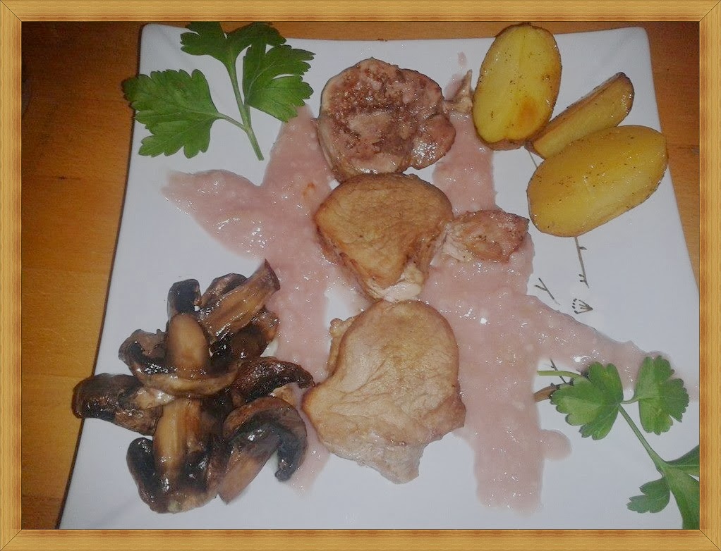 Ya tenemos la salsa y el solomillos con las patatas de luxe y los champiñones ahora solo falta decorar el plato.