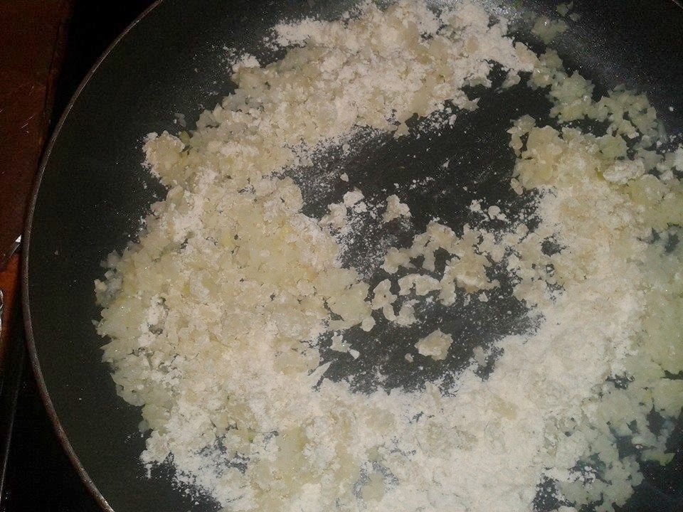 -Cuando ya este doradito el ajo y la cebolla introducimos la maicena y dejamos un minuto que se fria con los demás componentes. Aproximadamente así.