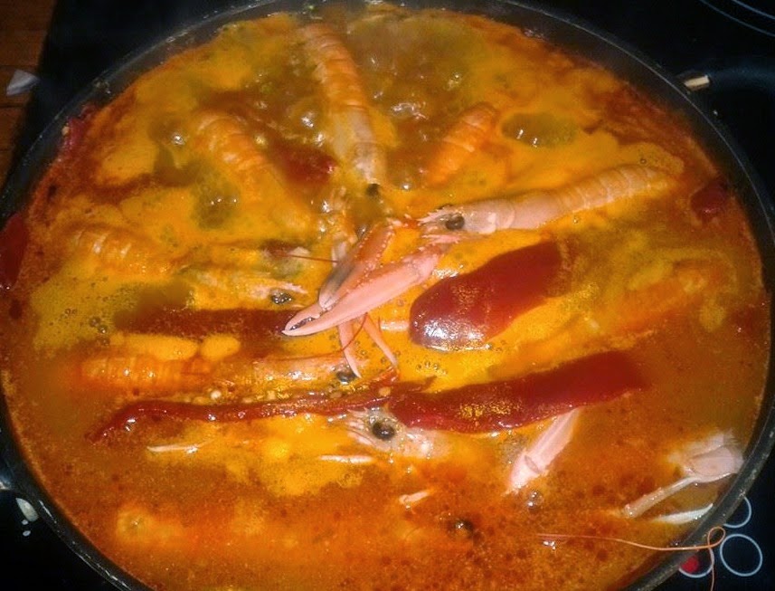 - Para finalizar echamos la fideuá y salteamos las cigalas por la paellera o sartén y los pimientos rojos.