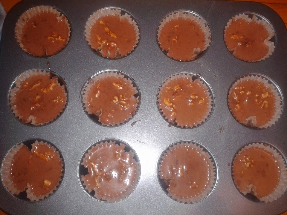 - Ahora colocamos nuestros vasitos de magdalenas en los moldes y rellenamos. Yo en cada vasito me ocupe de que tuviera cada uno nueces y un trocito de chocolate.
