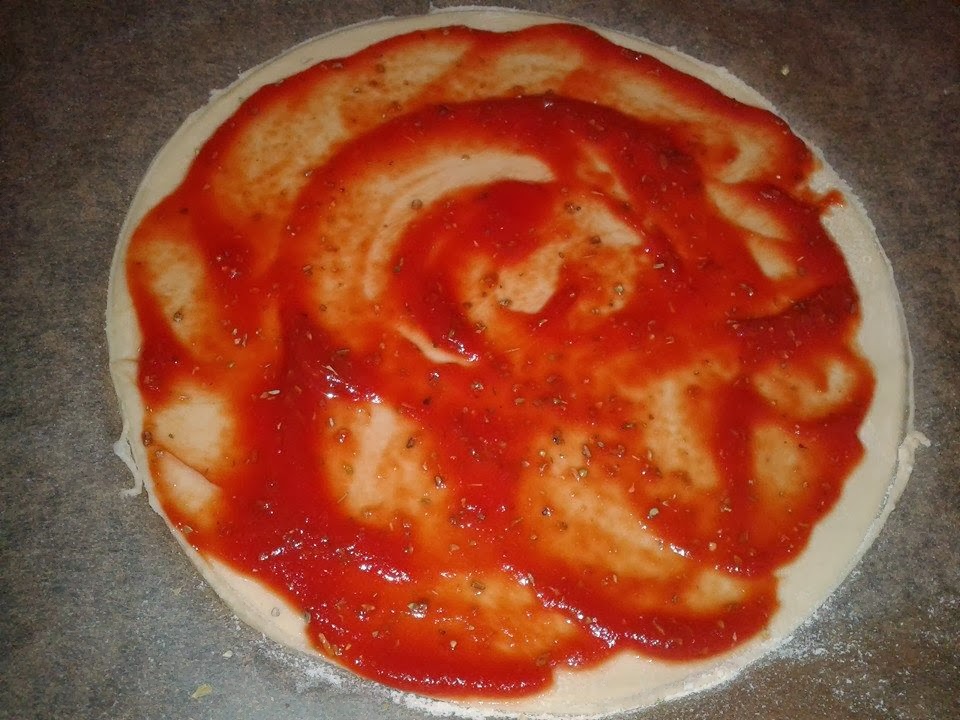 - Seguidamente el tomate extendido por toda la pizza.