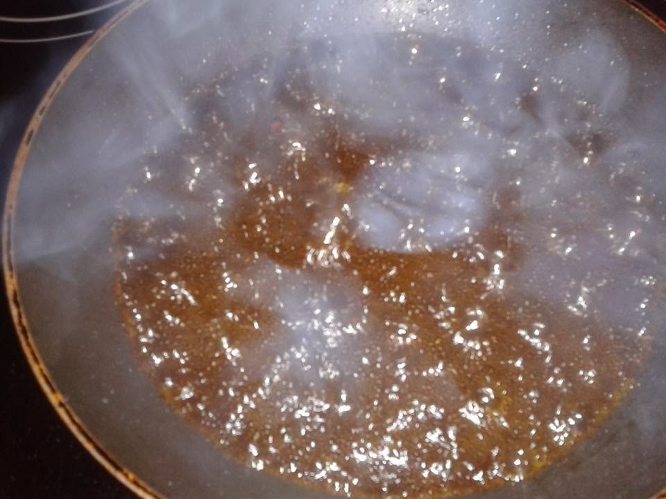 - En el mismo aceite donde freímos los ajos echamos 2 cucharadas de pimienta molida e inmediatamente agregamos la carne cortada en pedazitos pequeños. La freímos hasta que se quede bien churruscadita.