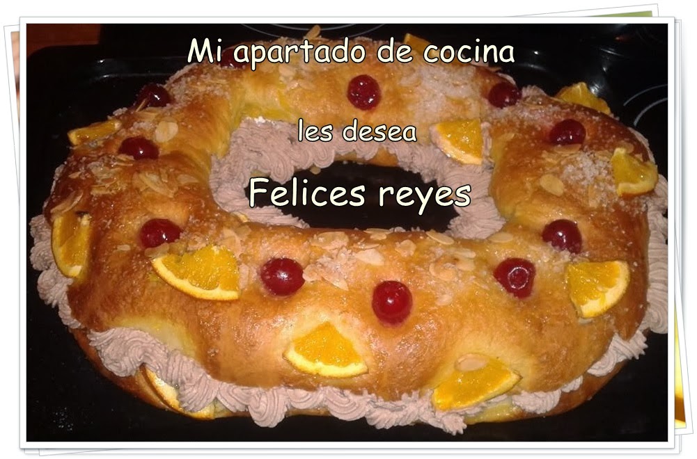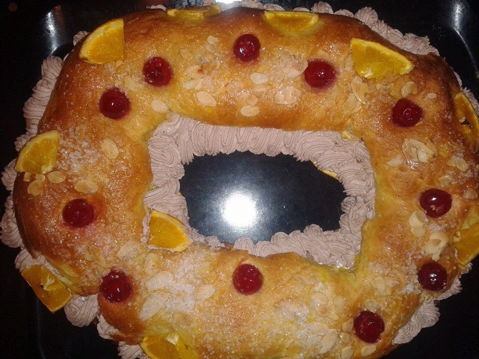 - Cuando el roscón este frió lo partimos a la mitad y si queréis le podéis meter una sorpresa envuelta en film, una nota dinero o un regalito de cerámica chiquitito. Lo rellenáis y listo para comer.