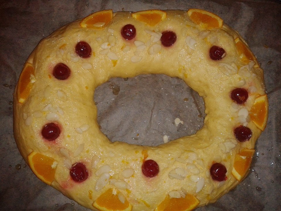 -Calentamos el horno a 160º pasados 5 min metemos el roscón durante 30 min. Como ya dije antes con el pulverizador dar toques de agua cada 10 min.