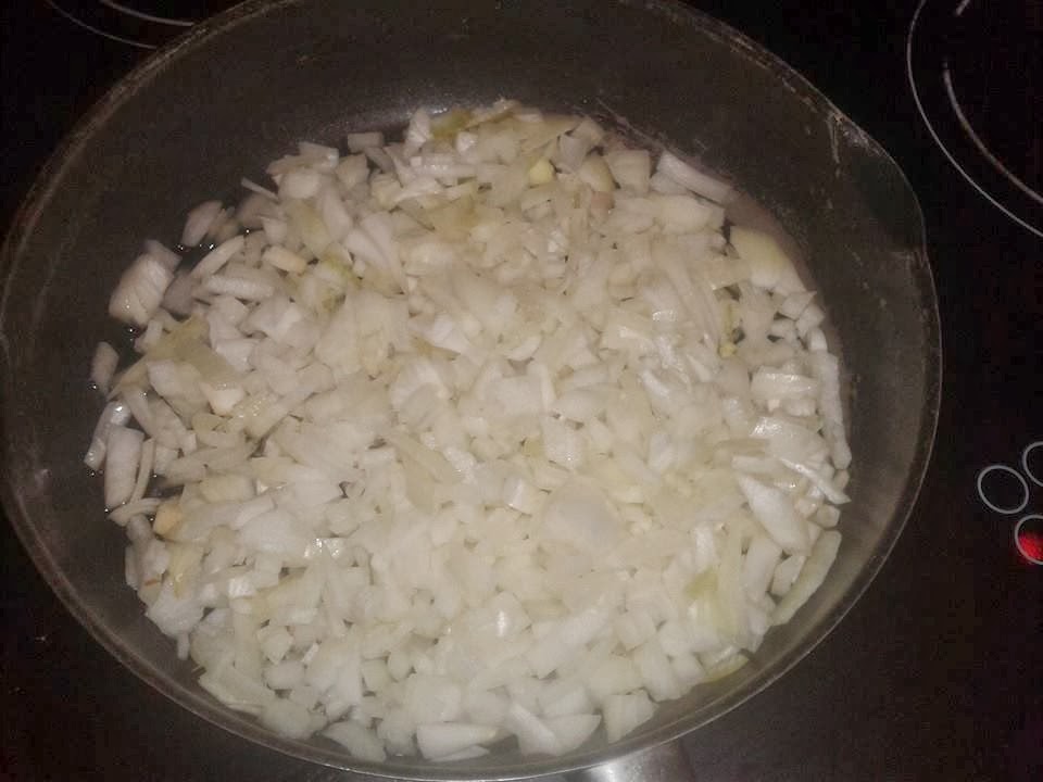 - Ponemos cebolla picada en una sartén con una pizca de aceite y la freímos un poco.