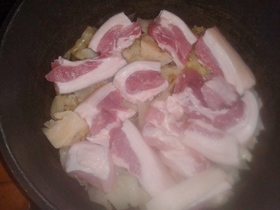 - Así rellenamos todos los sarmale, mientras en una olla preparamos una cama con el repollo que nos a sobrado los cortamos pequeño y hacemos una cama con el dejamos un poco para luego tapar también. Encima de la cama de repollo ponemos la carne de cerdo o panceta.
