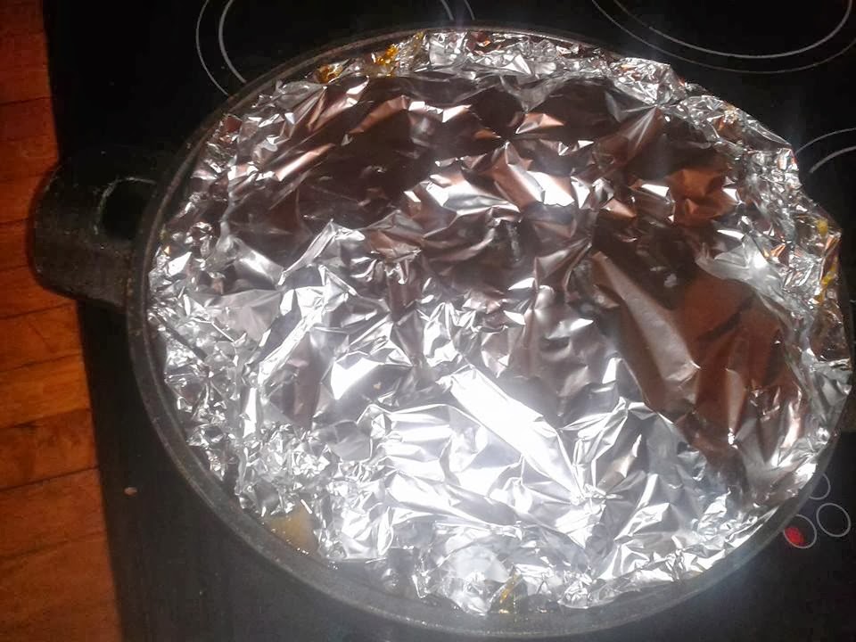 - Todo listo ahora y para finalizar se cierra de nuevo con repollo y un papel de aluminio. Echamos agua hasta arriba y pimienta roja para darle color.