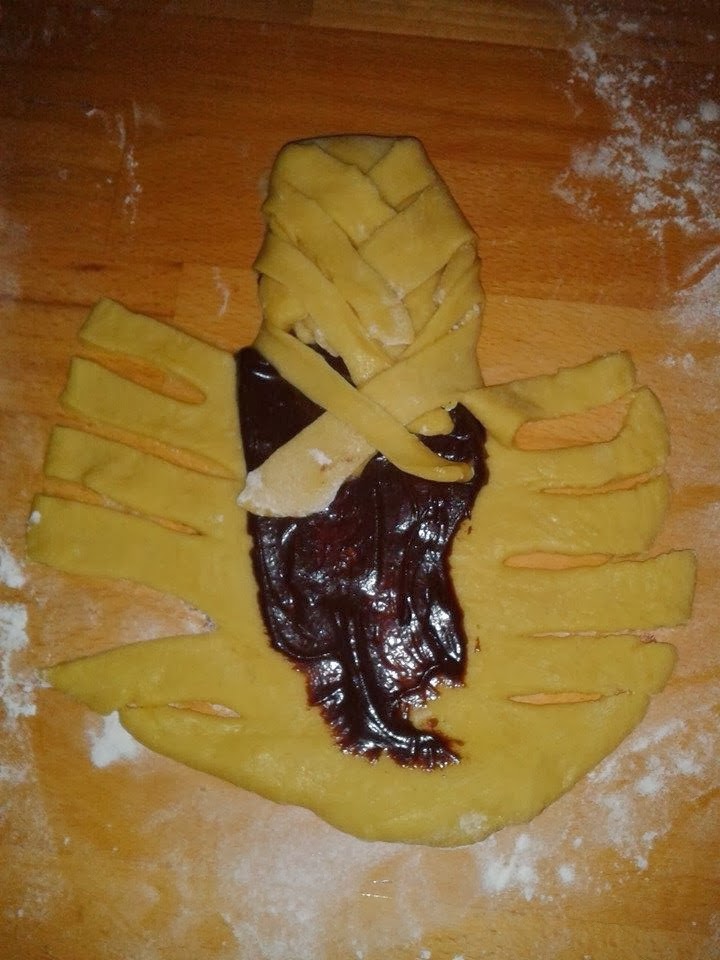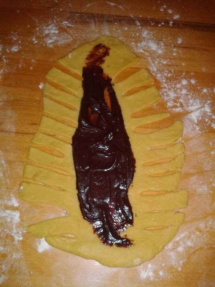 -Tenéis que cortar las mismas veces por un lado que por el otro. echáis el relleno de chocolate y cerráis el lado mas grande superior primero luego los siguientes.