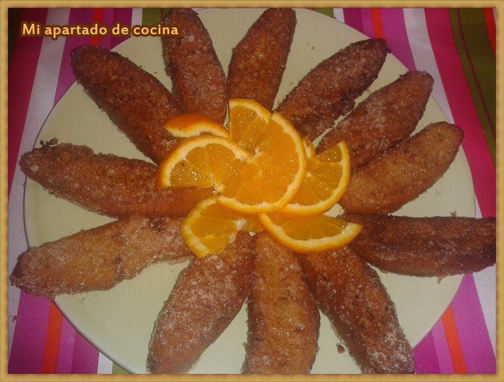 - Finalmente rebozamos las rodajas de pan en azúcar y canela. Las podéis decorar con unas rodajas de naranja al final.