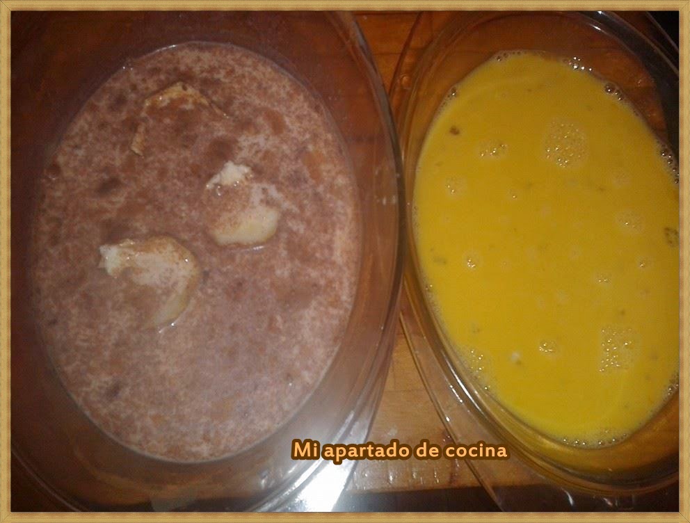 - Ya tenemos preparados la leche y los huevos listos para el rebozado de pan. Cogemos las rodajas de pan y las dejamos 5 minutos en leche que remojen, pasados los 5 minutos rebozamos en huevo otros minutos.