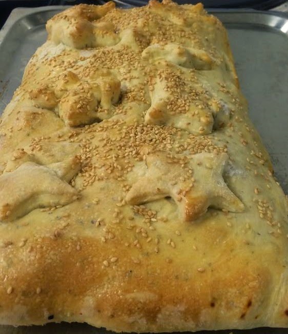 tomate, queso, lo cerré con otra capa encima, le puse de decoración estrellas de masa y sésamo.